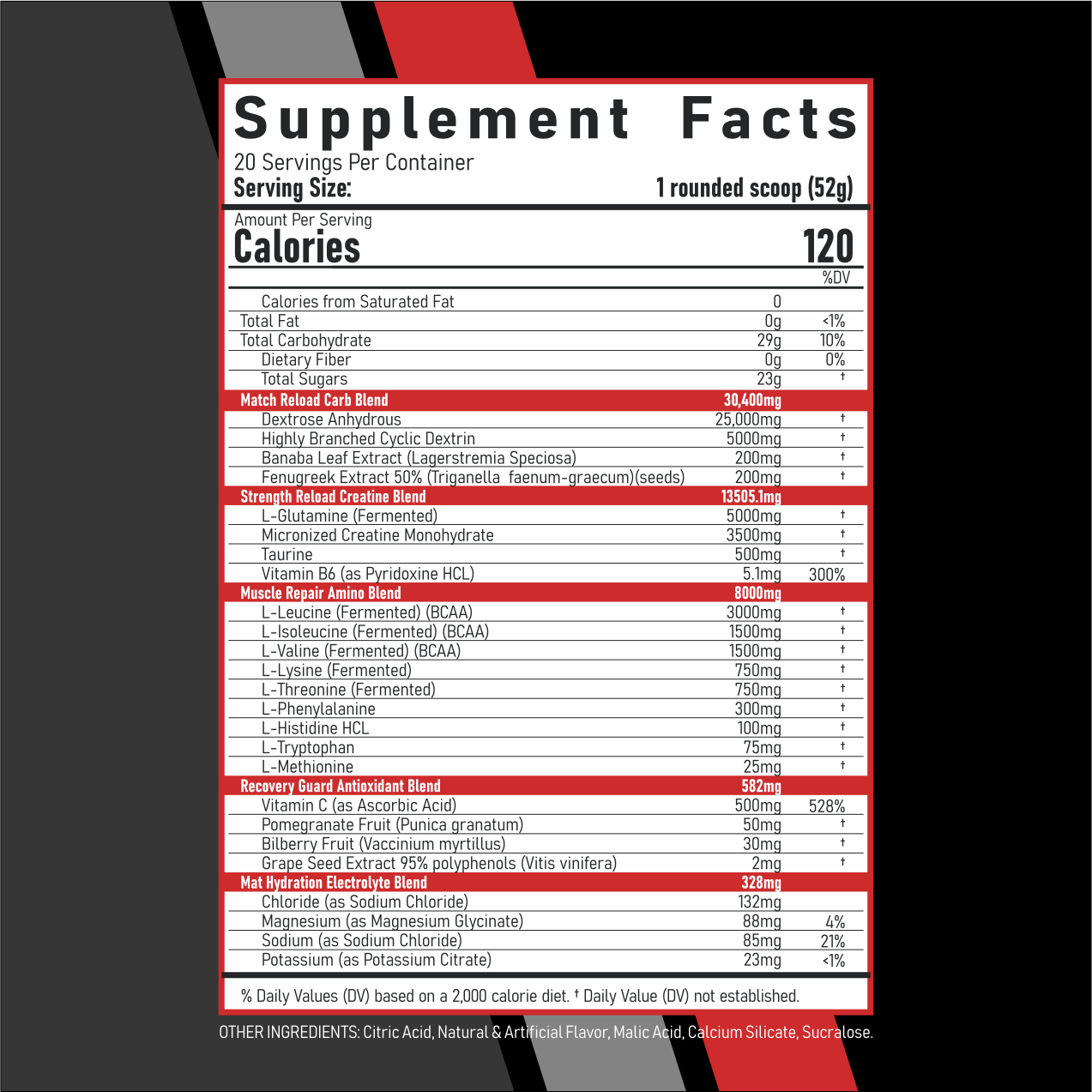 Perfect for long tournament days, multiple-match events, or high-volume training weeks, Match Reload helps replace depleted fuel stores and promotes proper fluid balance—so wrestlers can stay energized, focused, and prepared to compete at their best from the first whistle to the final match.